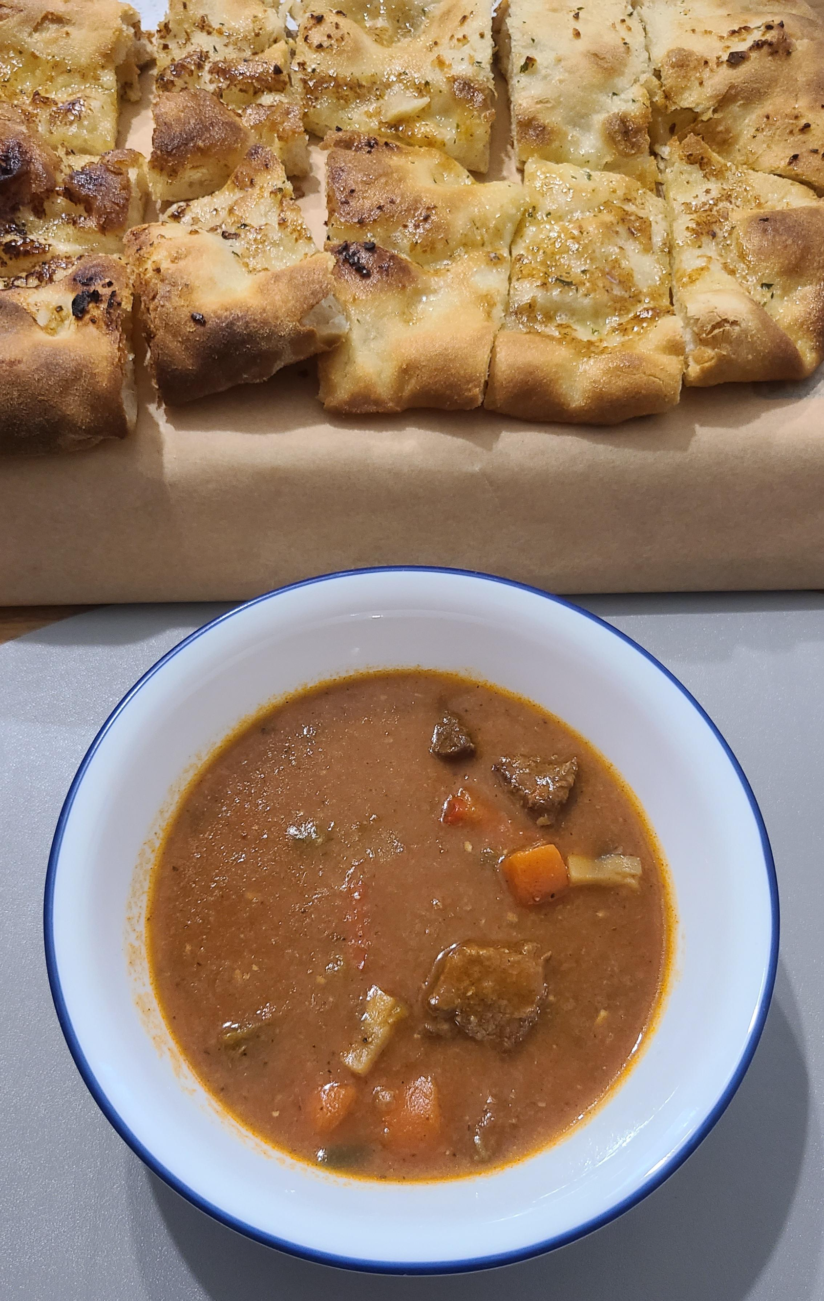 나와 남편 모두 매콤한 음식을 좋아해서, 엄청 매운 칠리플레이크를 조금 추가했더니 입이 살짝 얼얼한 것이 얼큰하기까지 하다. 서양음식 느낌이 물씬 나는.... 육개장 같달까? 플랫브래드에 마늘버터를 녹여 바르고 오븐에서 살짝 구워낸 뒤 조금 떼어낸 것을 수저삼아 부드러운 고기와 당근을 입에 넣으면 언 몸을 한 번에 녹일 수 있다.